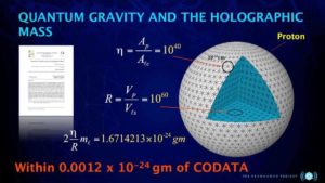 Haramein then calculates the external Planck circles divided by the internal Planck spheres to obtain the gravitational mass of the proton, which equals 10↑14 which is the exact amount of mass needed for the proton to obey what is called the the Schwarzschild condition of a black hole.