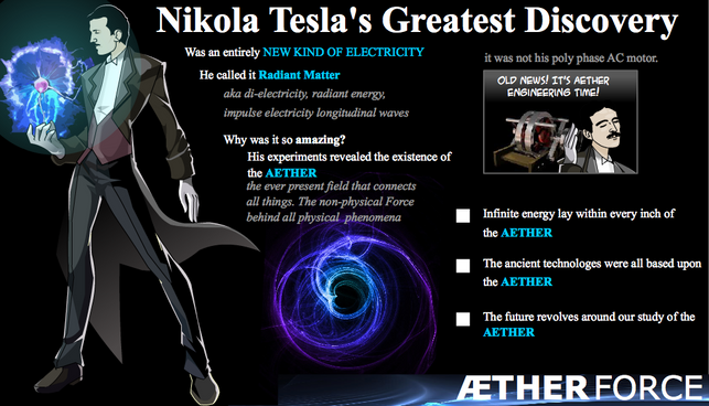 Tesla's Aether is described as Invisible and Unseen Phenomena. It is the foundation of a Quantum Field. It's currently part of the study of Dark Matter, and Dark Energy in the Universe/Multiverse. Noted as his greatest achievement, Tesla's Aether is said that the study of Aether will progress us as a society, based on Tesla's findings.