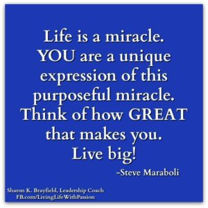 Life is a miracle. YOU are a unique expression of this purposeful miracle. Think of how GREAT that makes you. Live big! You are not here to dwell within the basement of your potentiality.