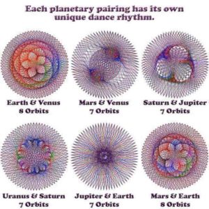 Here are drawings representing the path of planets coupled together over several year periods, illustrating their geometric dance relationship in patters that look very similar to those made in Cymatics.