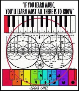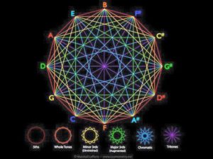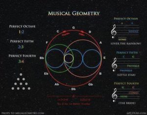 The musical system known as the Circle of fifths form specific geometries. All matter is a vibration in the structure of space-time and the study of the structure of space is called geometry, therefore music and matter itself is geometry in motion…